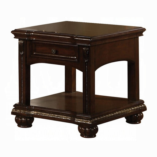 ACME WestThe Anondale End table is finished in brown cherry. Featuring Storage Drawers combined with modern style found in clear glass insert top and casua...