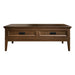 With a subtle lodge look that takes inspiration from design history, the classic styling of the Frazier Park Collection will help you create a living room environment that’s a reflection of your preference for traditional spaces. The brown cherry finish of the cocktail table highlights the mindy veneer, providing rich character to the wood’s grain. Horizontal fixed pull hardware fronts the functional drawers of each leg table lending subtle contrast to the collection’s finish. Sofa table and end table are also available. 52 x 28.25 x 19H