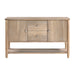 Enhance your dining or living space with the rustic charm and practical storage of this acacia wood server. Crafted from acacia veneer, solid wood, and engineered wood, this server features a beautiful wire-brushed power glaze natural finish that highlights the wood's natural grain. It offers ample storage with two smooth-gliding dovetail drawers, two side cabinets each with an adjustable shelf, and a bottom open shelf for display. The polished chrome tone knobs add a touch of elegance, complementing the server's warm and inviting aesthetic. This versatile piece provides both style and functionality, making it a perfect addition to any home.